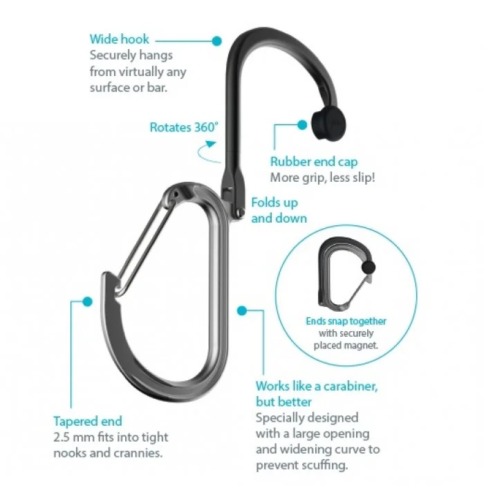 With a rotating arm, the Qlipter becomes a carabiner with a hook that is useful to hang off everything including flat surfaces thanks to a rubber piece at the end. It also has a tapered nose to squeeze into hard to hook places.