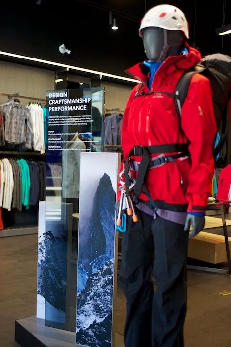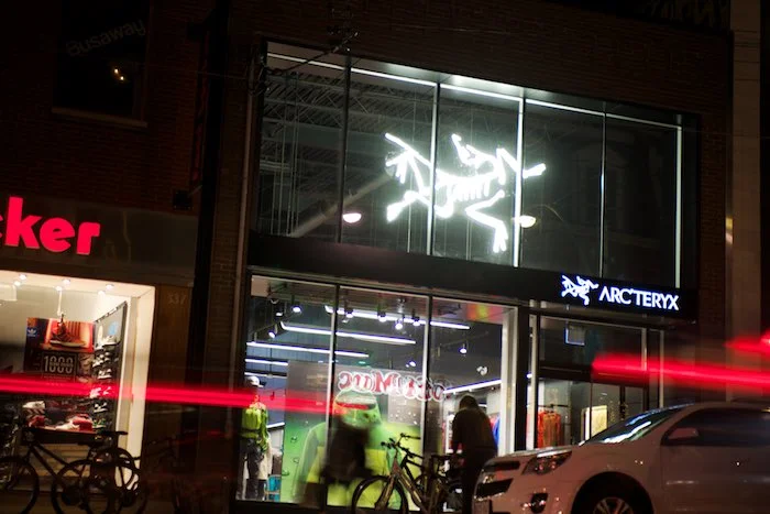 On a funny side note...one of the installers took setting up the large Arc’Teryx illuminated logo to a new level as once he saw what the task involved, he went home to get his climbing gear (rope and Grigri) to hoist it up. It was a little unconventional, but right in line with what Arc'Teryx is all about.