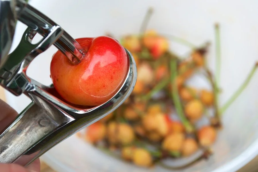 To prepare them, cut them in half lengthways and remove the pit, or purchase a cherry pitter to speed up the process.
