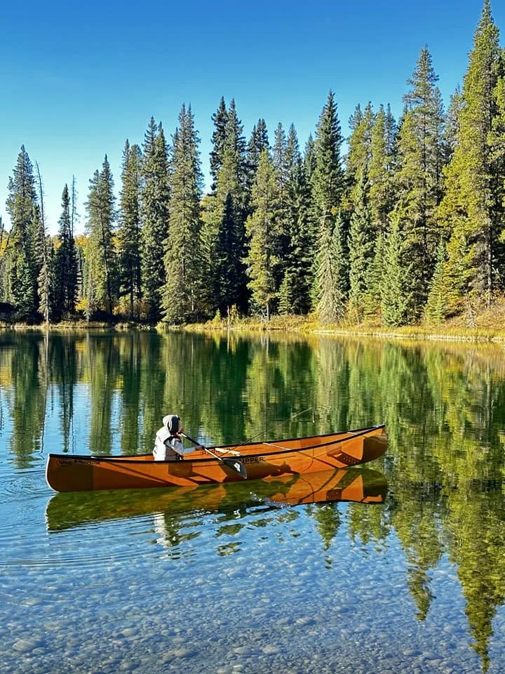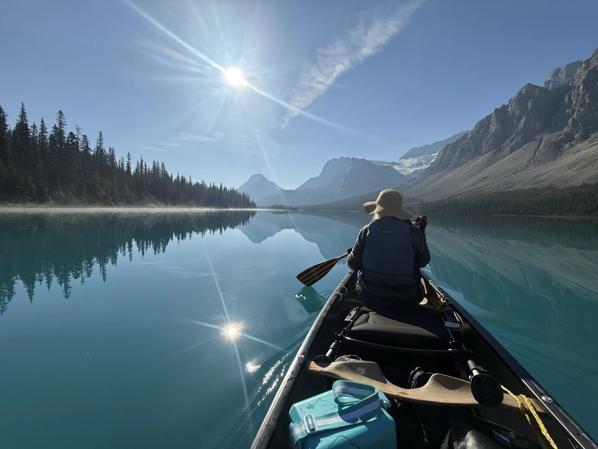 Tom Snossen: Paddling glass in beautiful Bow Lake, Banff National Park, August 2025 - my wife Donna in our red Esquif Prospector