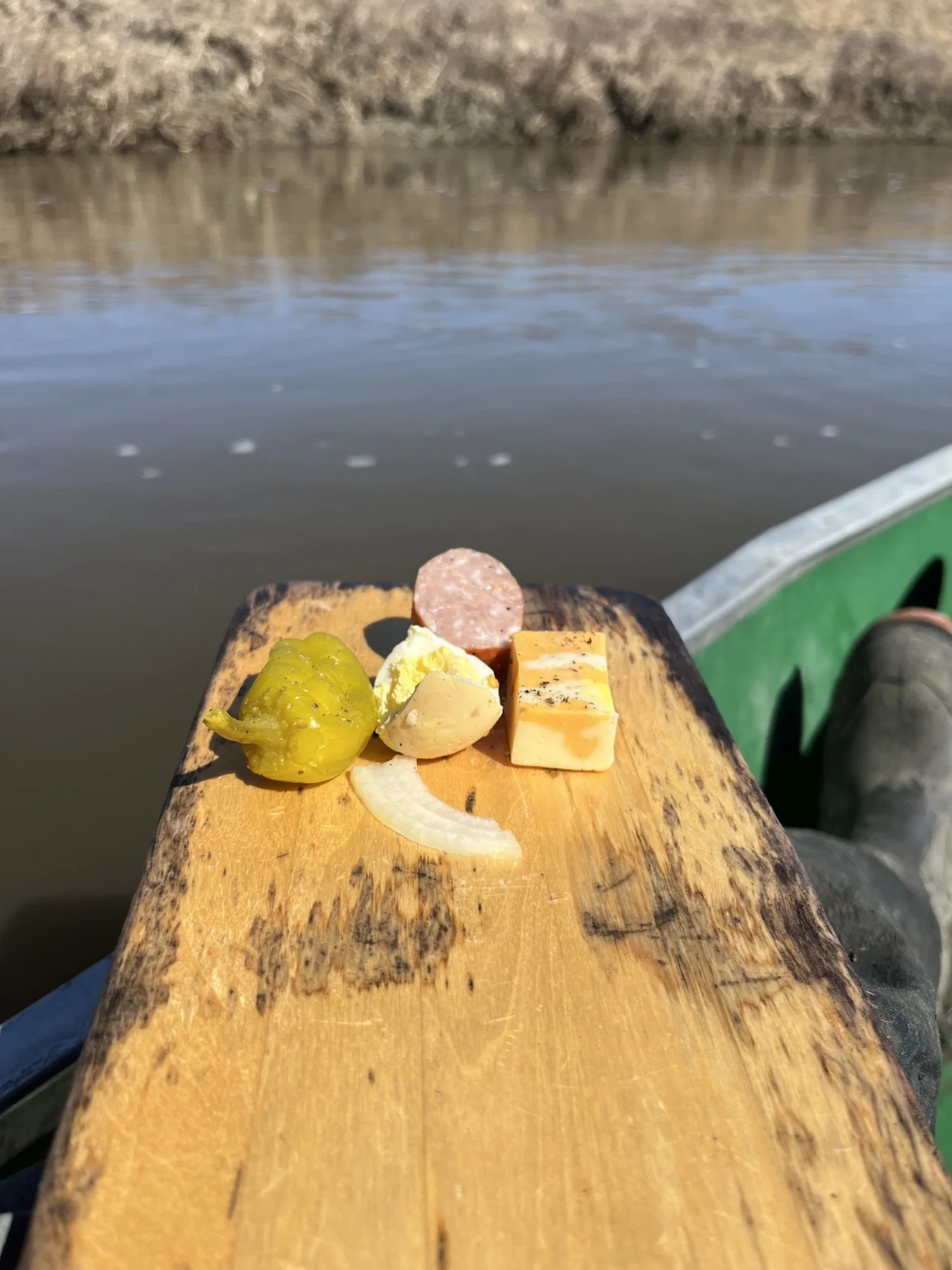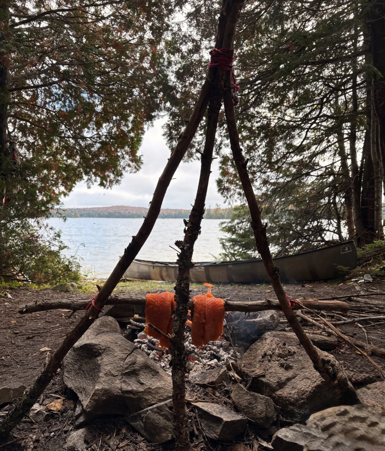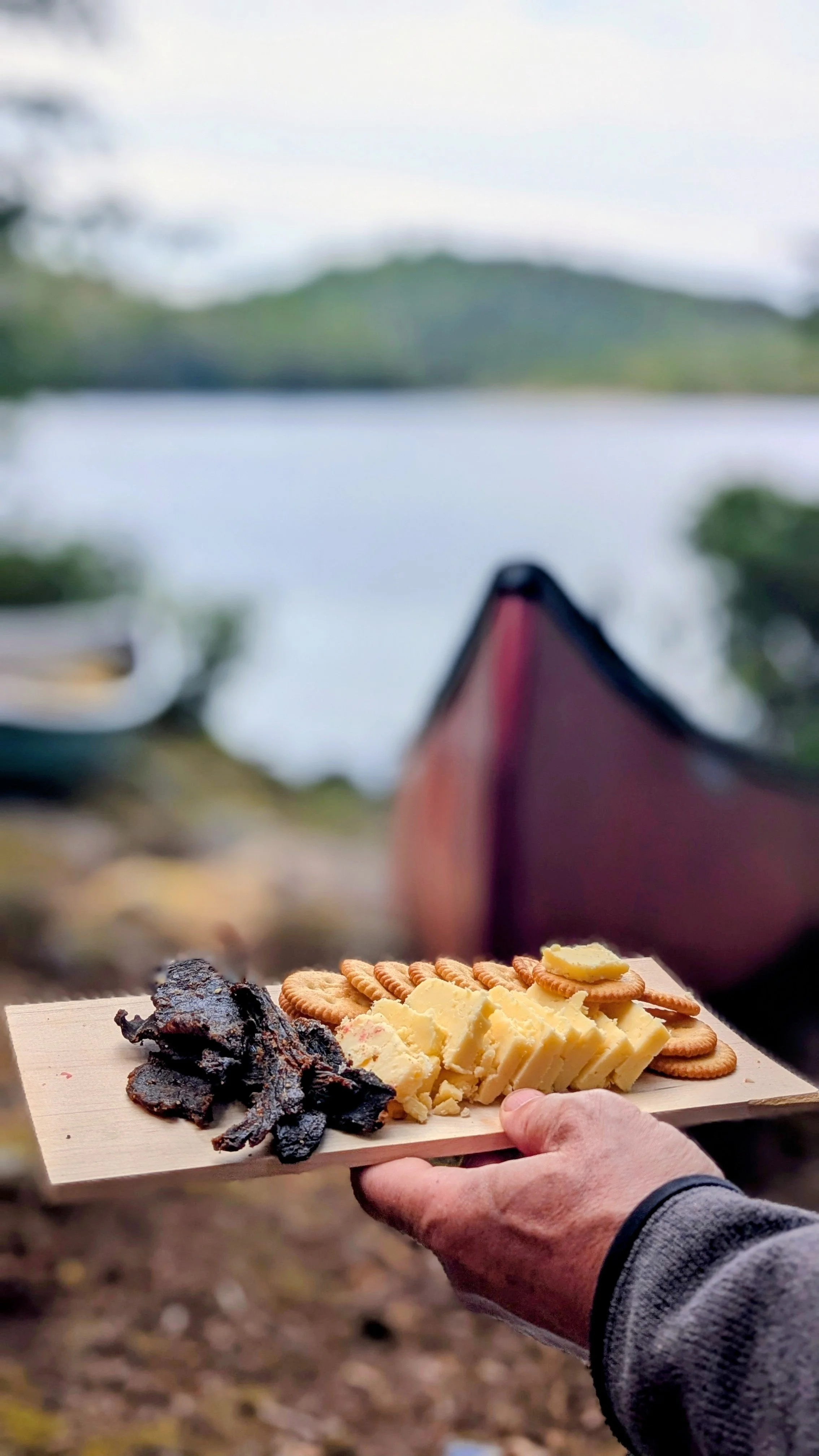Sophie Gascon: Post-portage pit stop, from Lady Evelyn Lake to Sucker Guy Lake. Had to keep these hungry teen boys happy! Charcuterie board on the go! Homemade beef jerky, sharp aged cheddar cheese and crackers 😋
