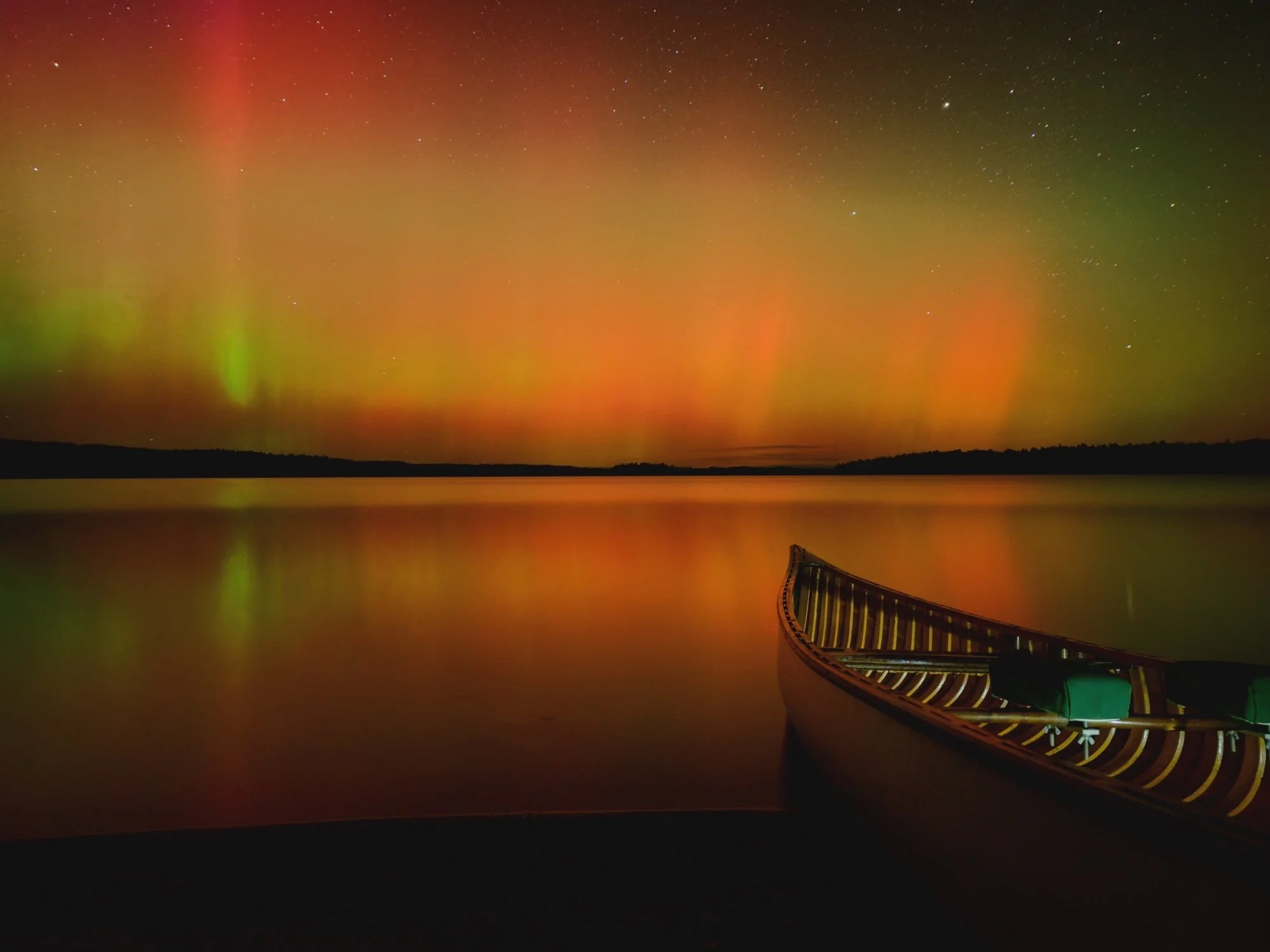 Chris Stromberg: Photo taken on November 12, 2025 during a G4 aurora storm. North of Quetico and only minutes from Atikokan, Canoeing Capital of Canada. Picture of my restored 70-year-old Peterborough cedar canvas canoe at the shoreline of Finlayson Lake between Quetico and White Otter-Turtle River Provincial Parks. Spent the night beside a campfire taking about a hundred photos and video.