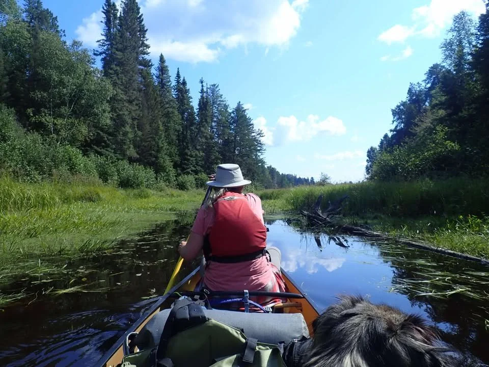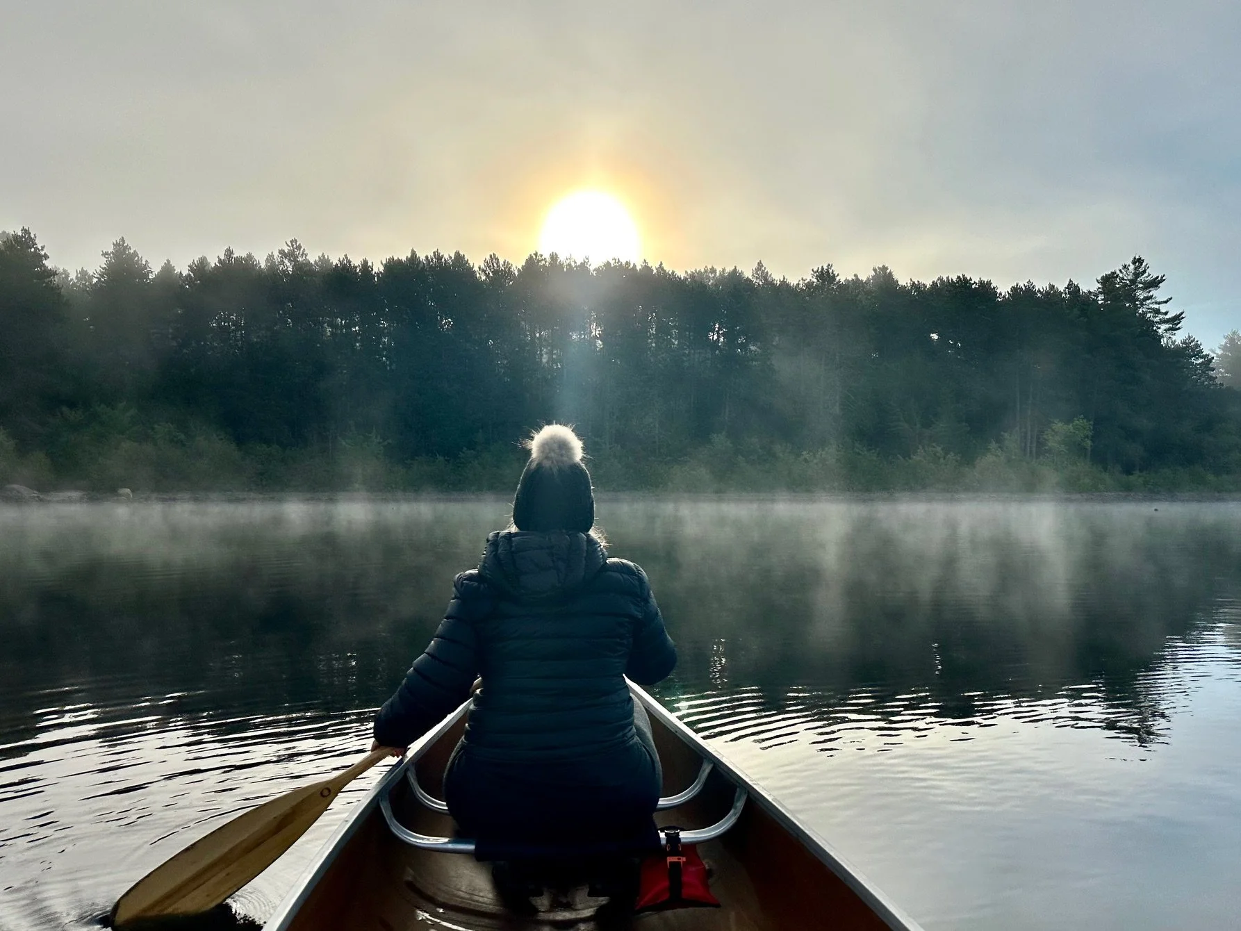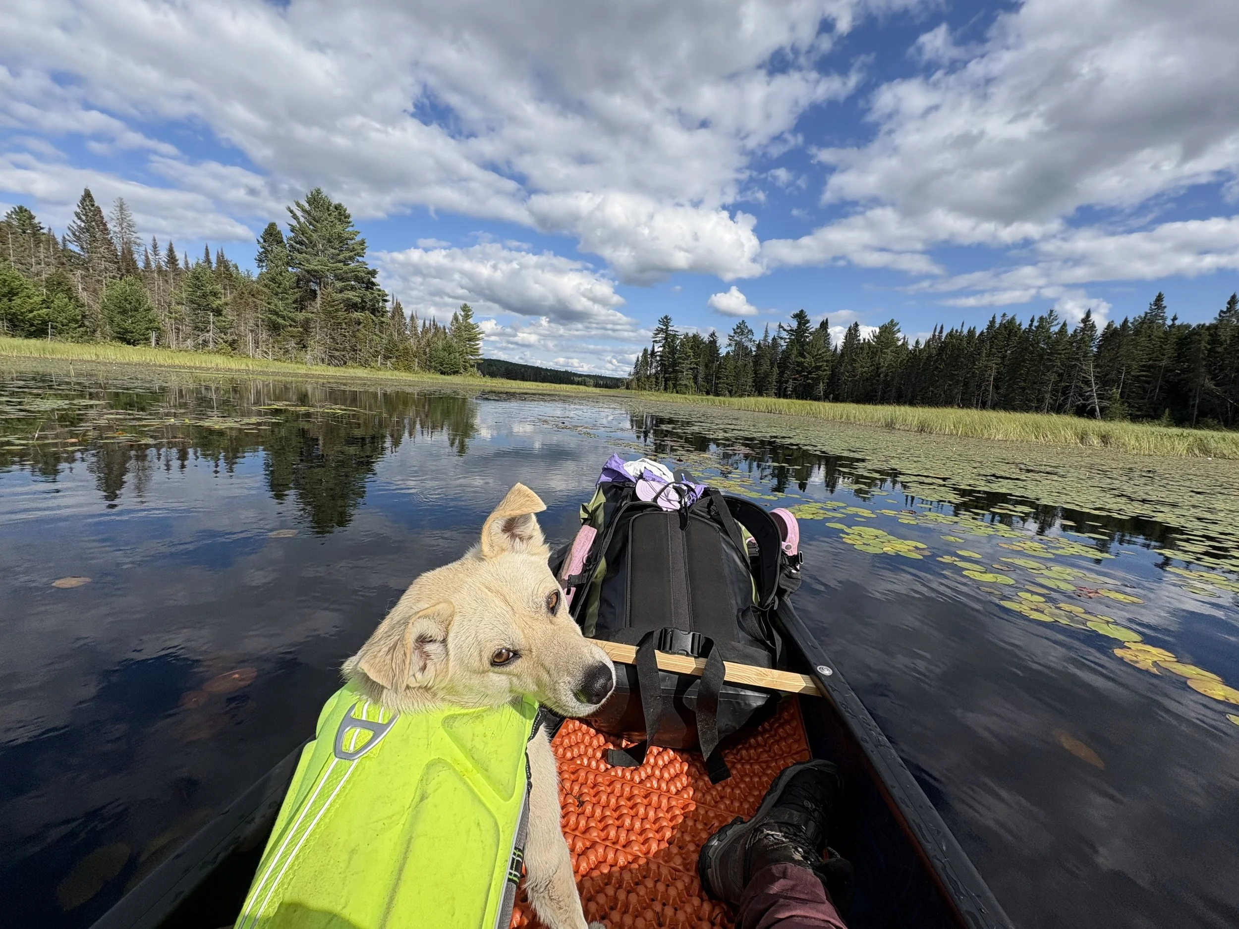 Julie Steininger: Fork lake Algonquin, Labour Day weekend 2025. It looks like we are bringing a black bear for a canoe ride, but it’s just our dog.