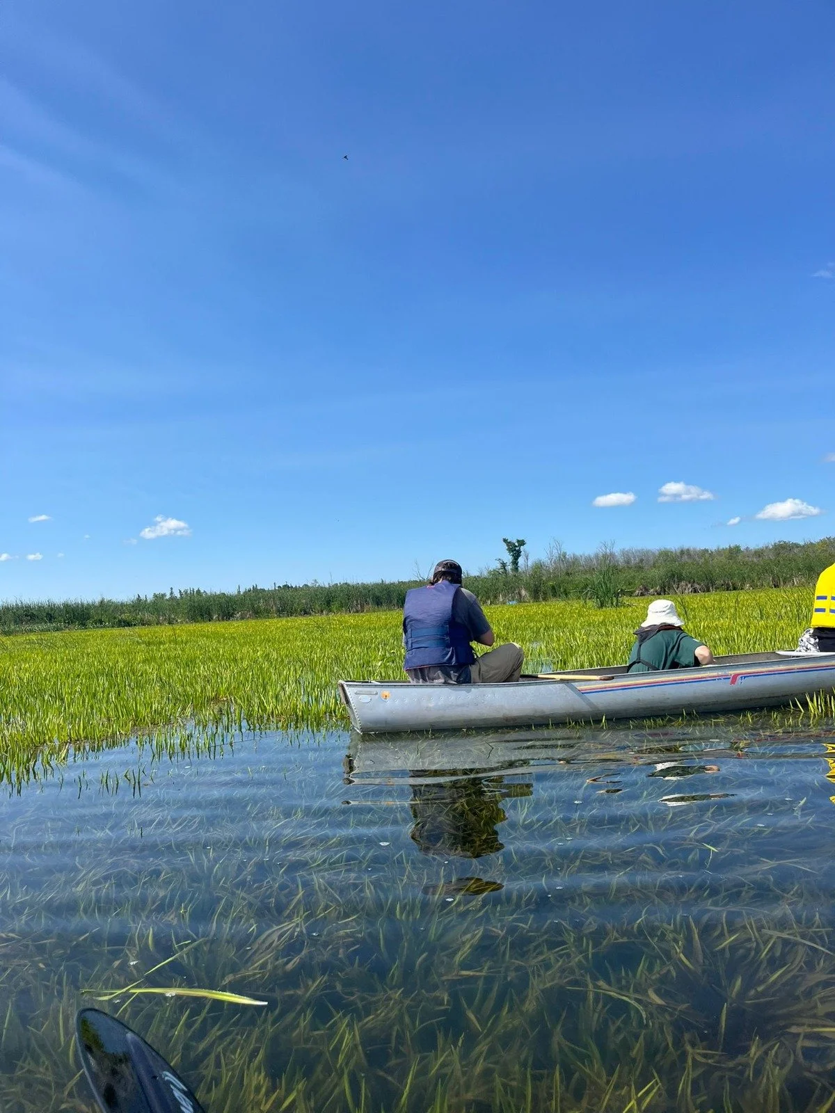 Lauren Rogers: Lake Simcoe in Ontario. This photo captures a community paddle event focused on monitoring for water soldier, an invasive aquatic plant that threatens local ecosystems. The image highlights community members coming together on the water to learn how to identify the species, practice safe monitoring/management techniques, and contribute to early detection efforts. The event reflects the power of collaboration and the importance of bringing volunteers, families, and local partners together to help protect waterways through hands-on education and stewardship.