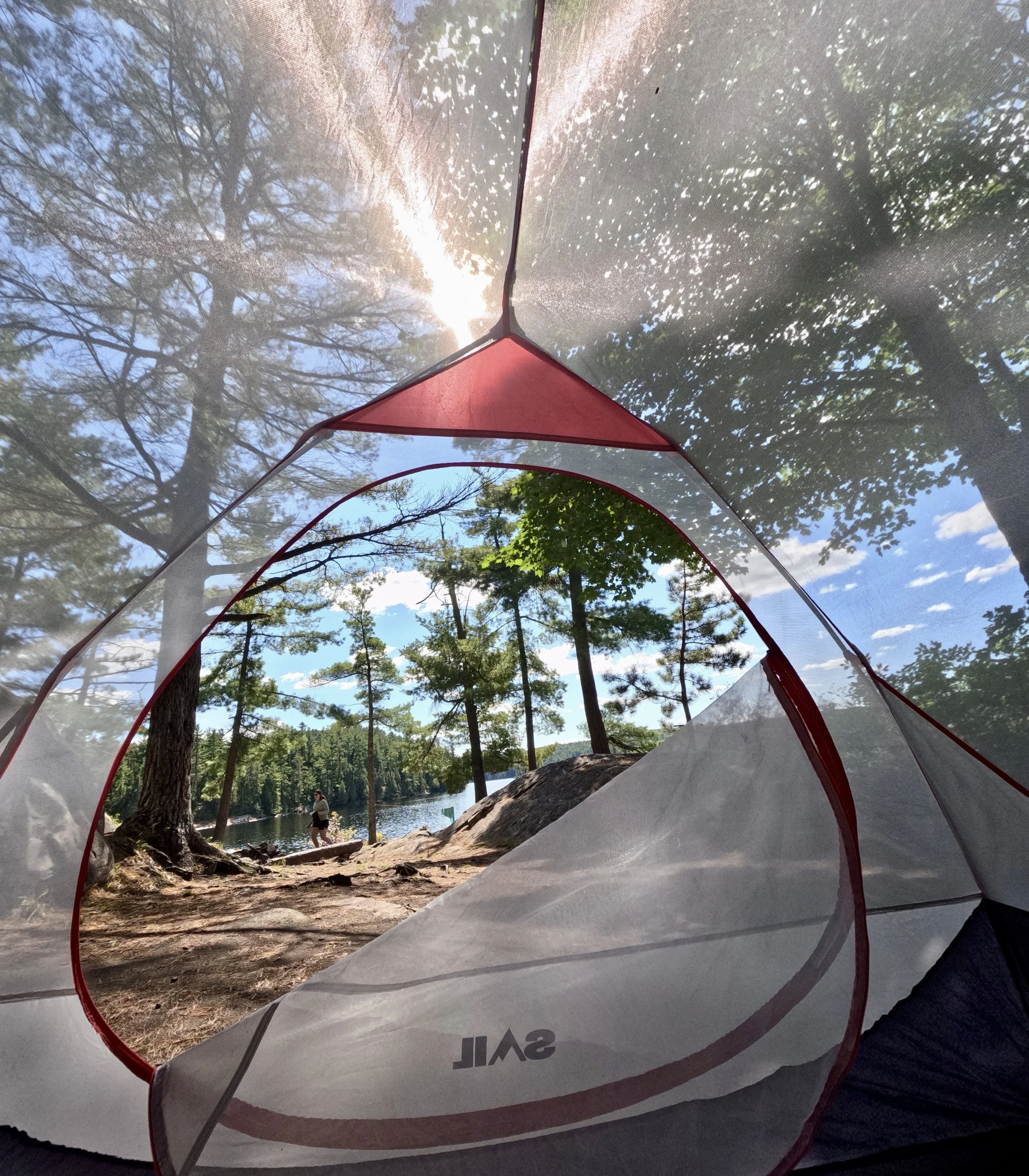 Katerina Simantirakis: inside of a tent looking out onto Tom Thomson Lake (in Algonquin Park)