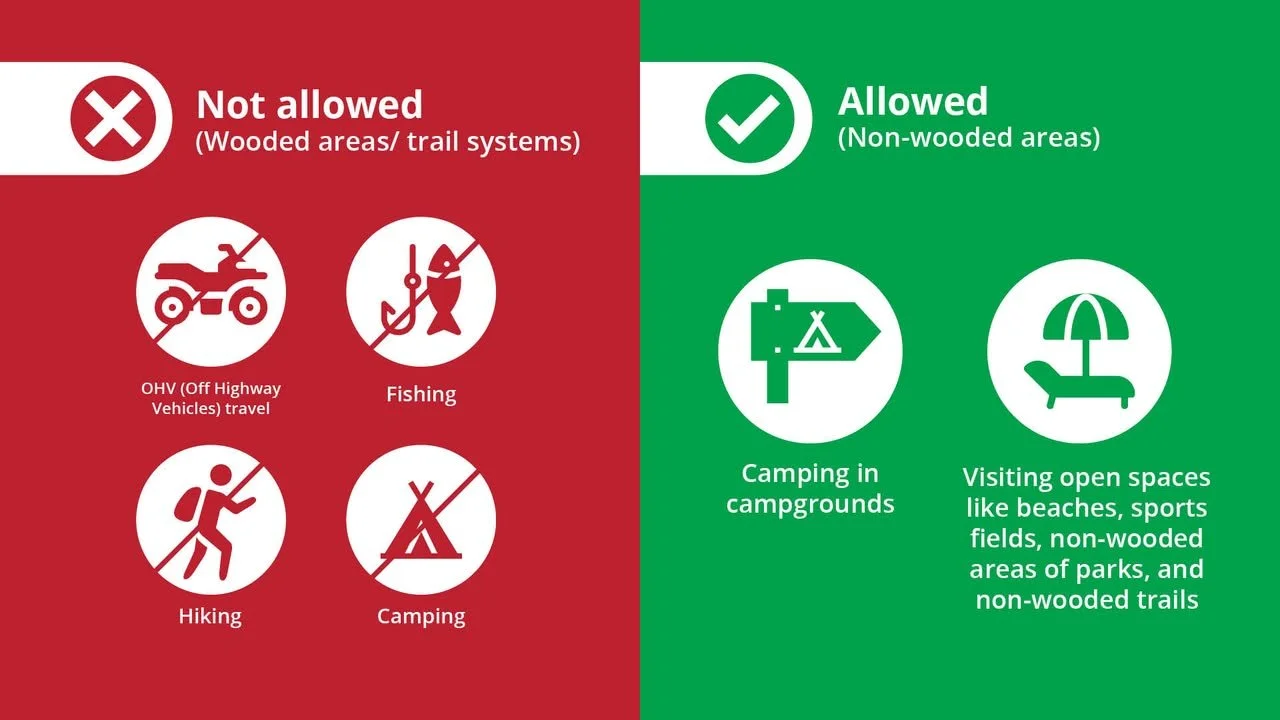 While the restrictions are in place, people can still access beaches and parks, but not the trail systems. Private landowners are free to use their own properties but cannot host others to use wooded areas of their properties.