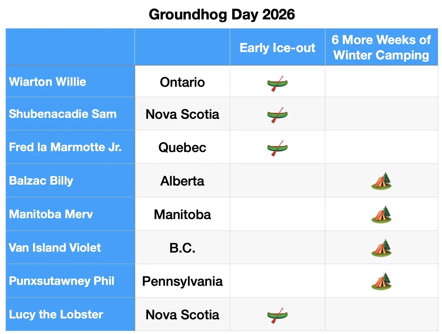Well it's Groundhog Day... again. The fate of our outdoor adventures rests in the hands of our Canadian ace weather predictors, Wiarton Willie, Shubenacadie Sam, Balzac Billy and Manitoba Merv. What are you hoping for? Six more weeks of Winter camping or early Ice-Out conditions?